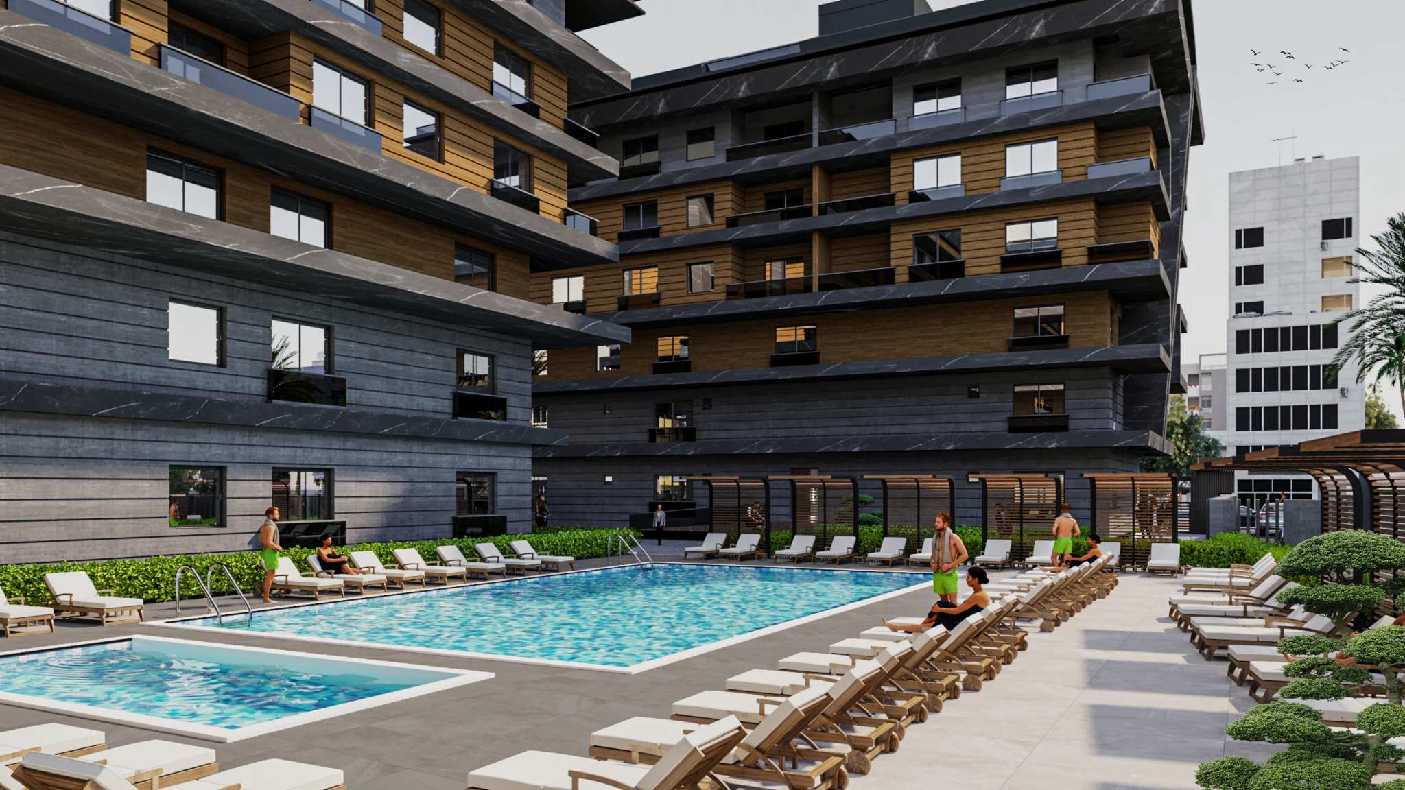 The project offers a wide range of social amenities, including a fitness center, outdoor swimming pool, children's playground, sitting areas, Turkish bath, and sauna.